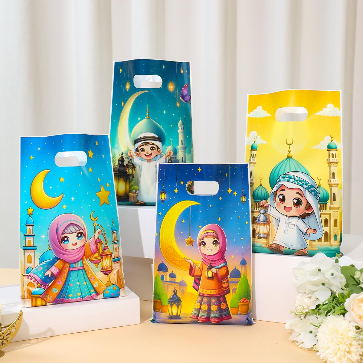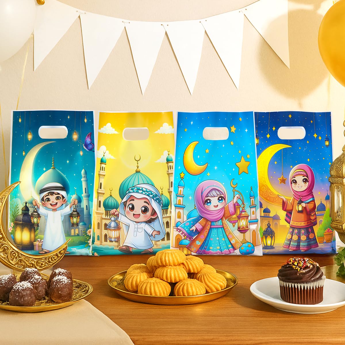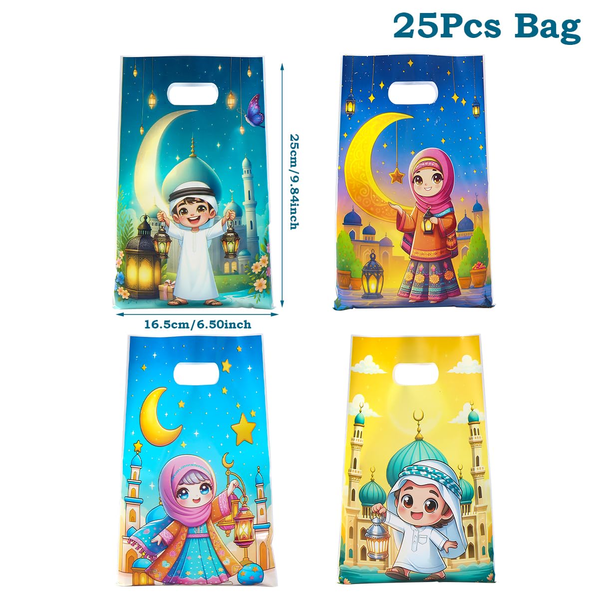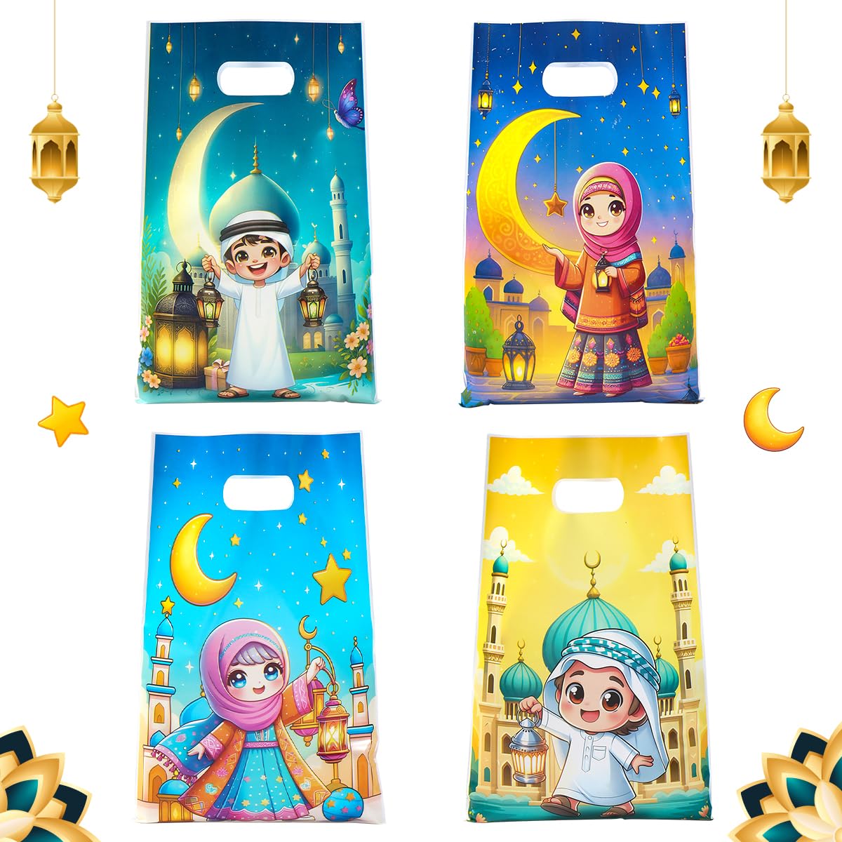 ٢٥ كيس هدايا رمضان كريم، أكياس بلاستيكية ملونة بأربعة ألوان متنوعة بنقشة فوانيس شخصيات كرتونية، مناسبة لتوزيع الحلوى والهدايا في حفلات الأطفال الإسلامية | متجر واو الأفضل ترينديول السعودية