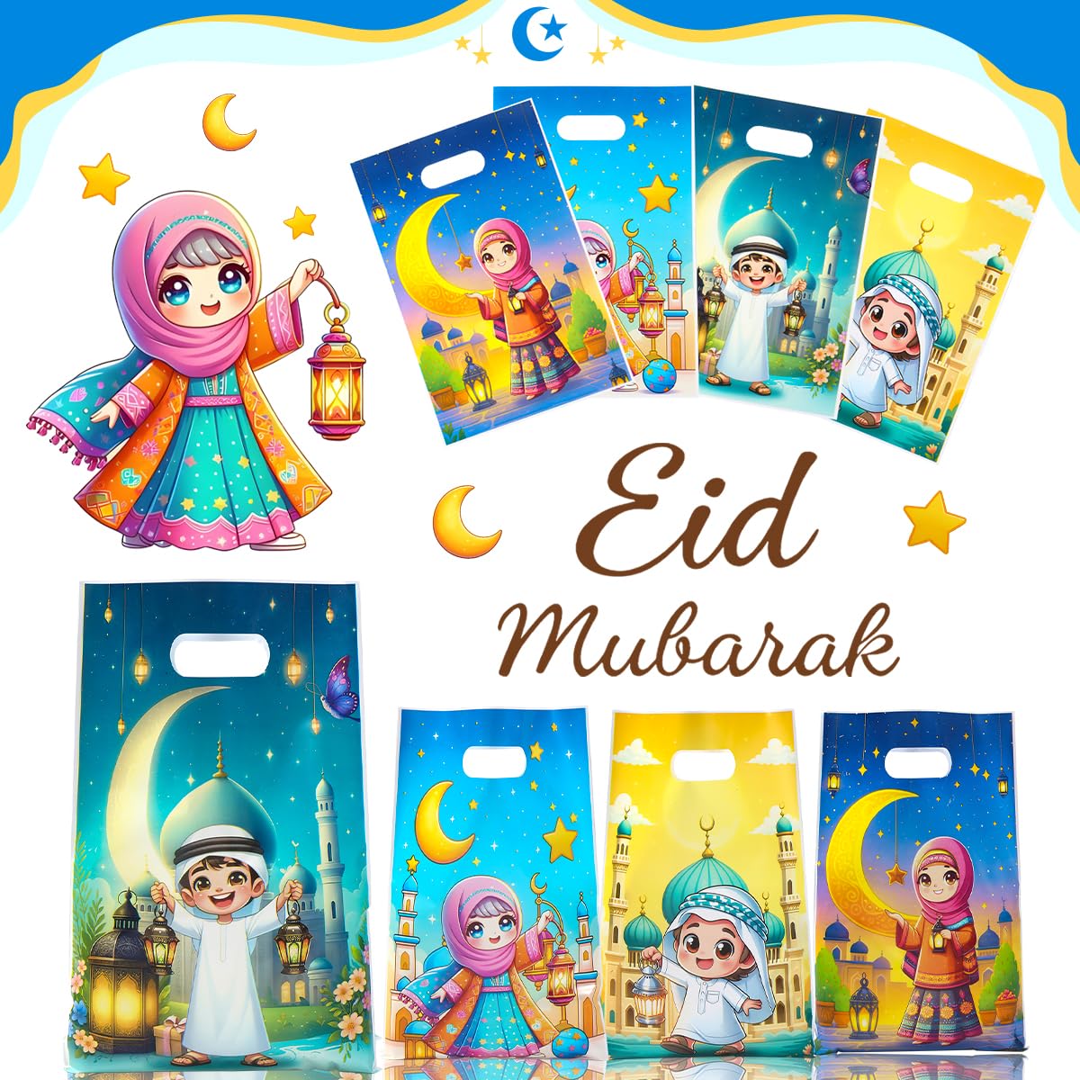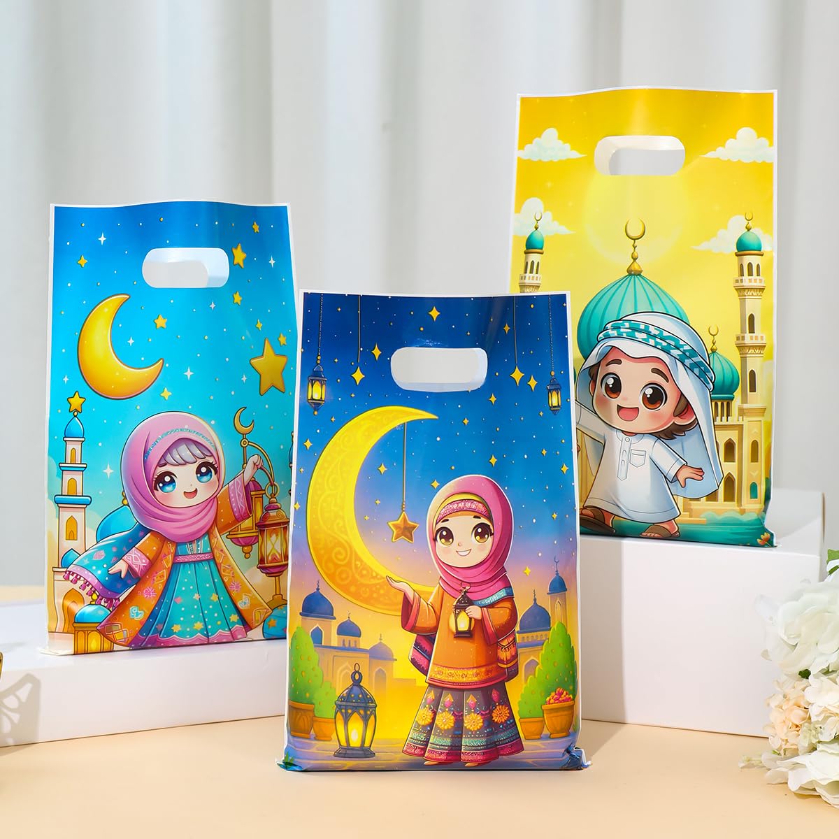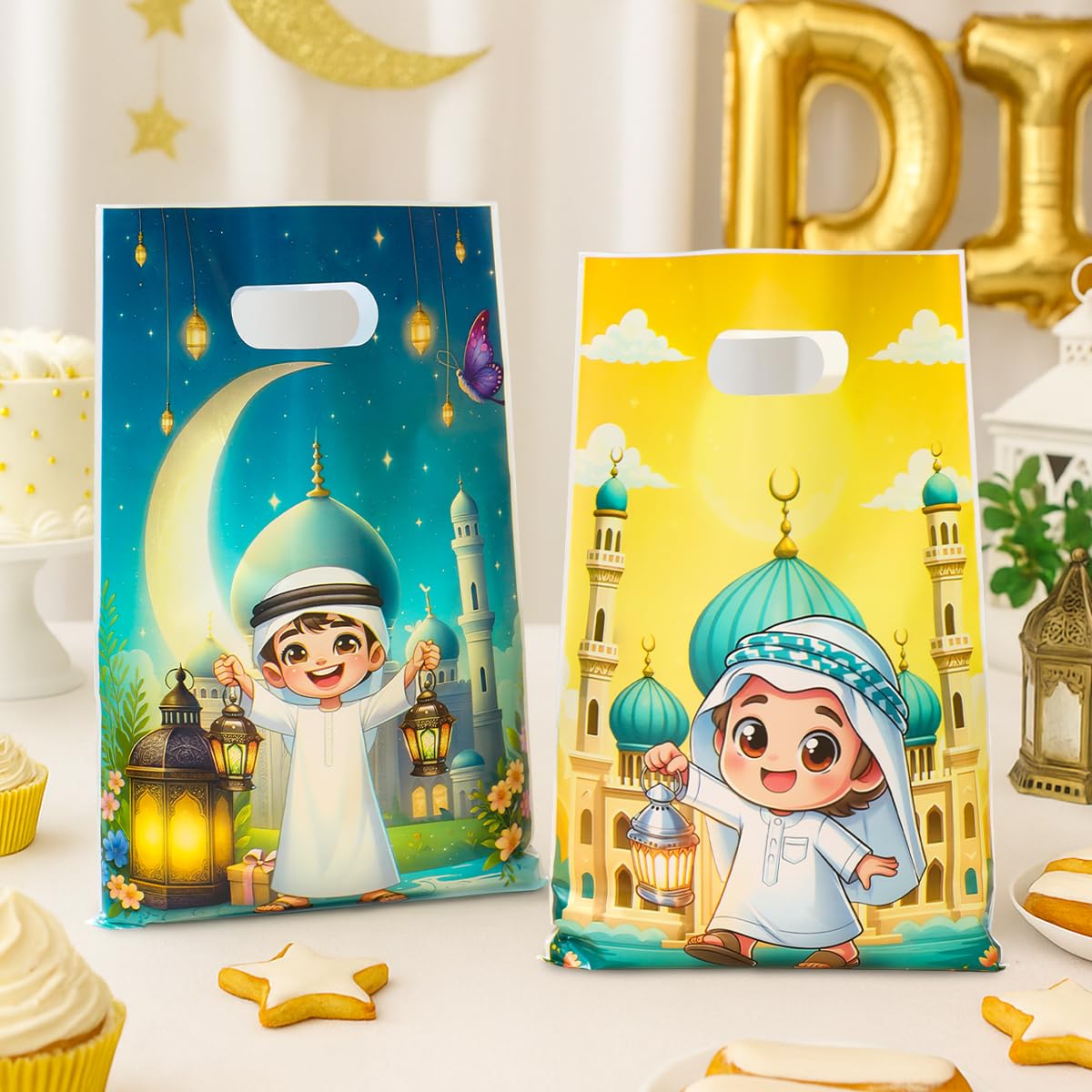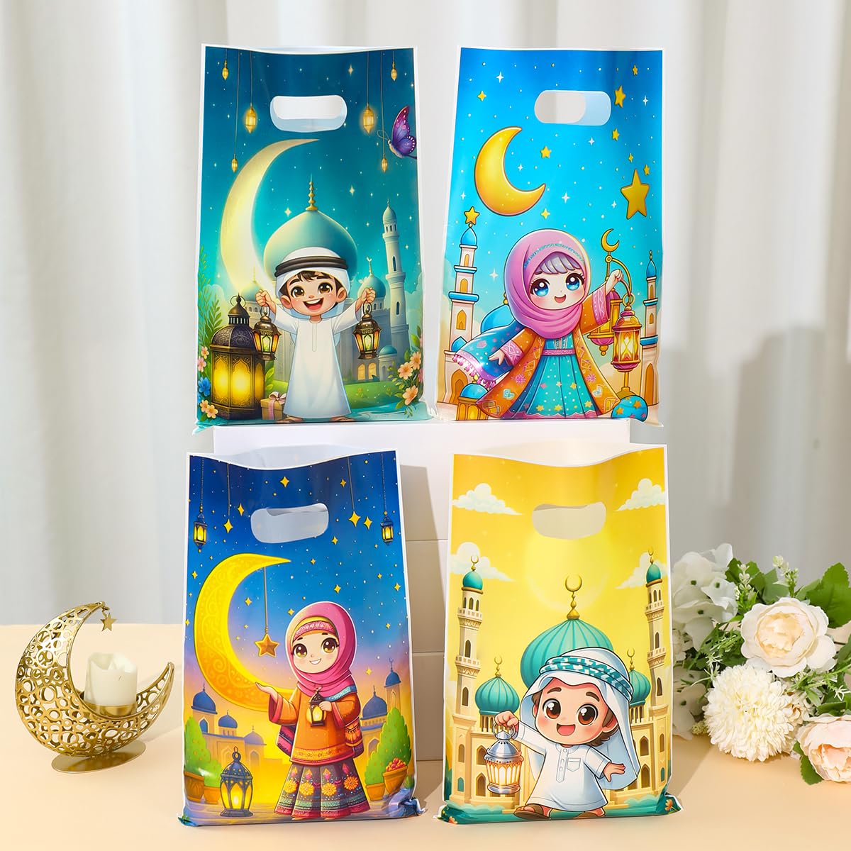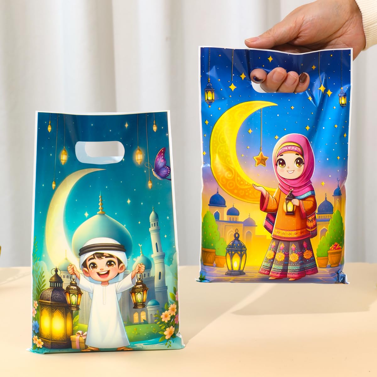 ٢٥ كيس هدايا رمضان كريم، أكياس بلاستيكية ملونة بأربعة ألوان متنوعة بنقشة فوانيس شخصيات كرتونية، مناسبة لتوزيع الحلوى والهدايا في حفلات الأطفال الإسلامية | متجر واو الأفضل ترينديول السعودية