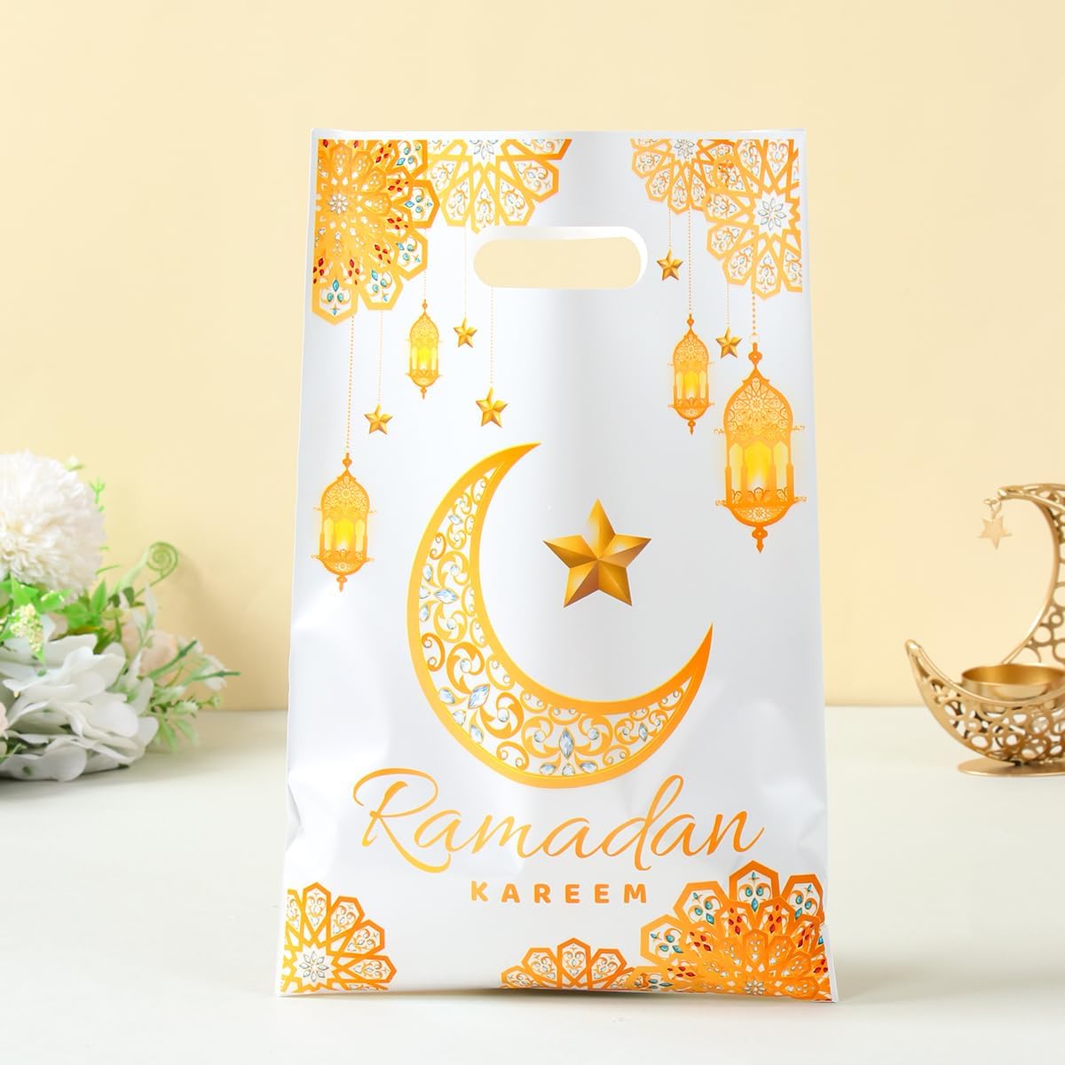 ٥٠ كيس هدايا رمضان كريم، أكياس بلاستيكية بيضاء مزينة بنقشة الهلال والنجوم الذهبية، مناسبة للحلويات والوجبات الخفيفة، مزودة بمقبض، مثالية كهدايا للأطفال في الحفلات الإسلامية | متجر واو الأفضل ترينديول السعودية