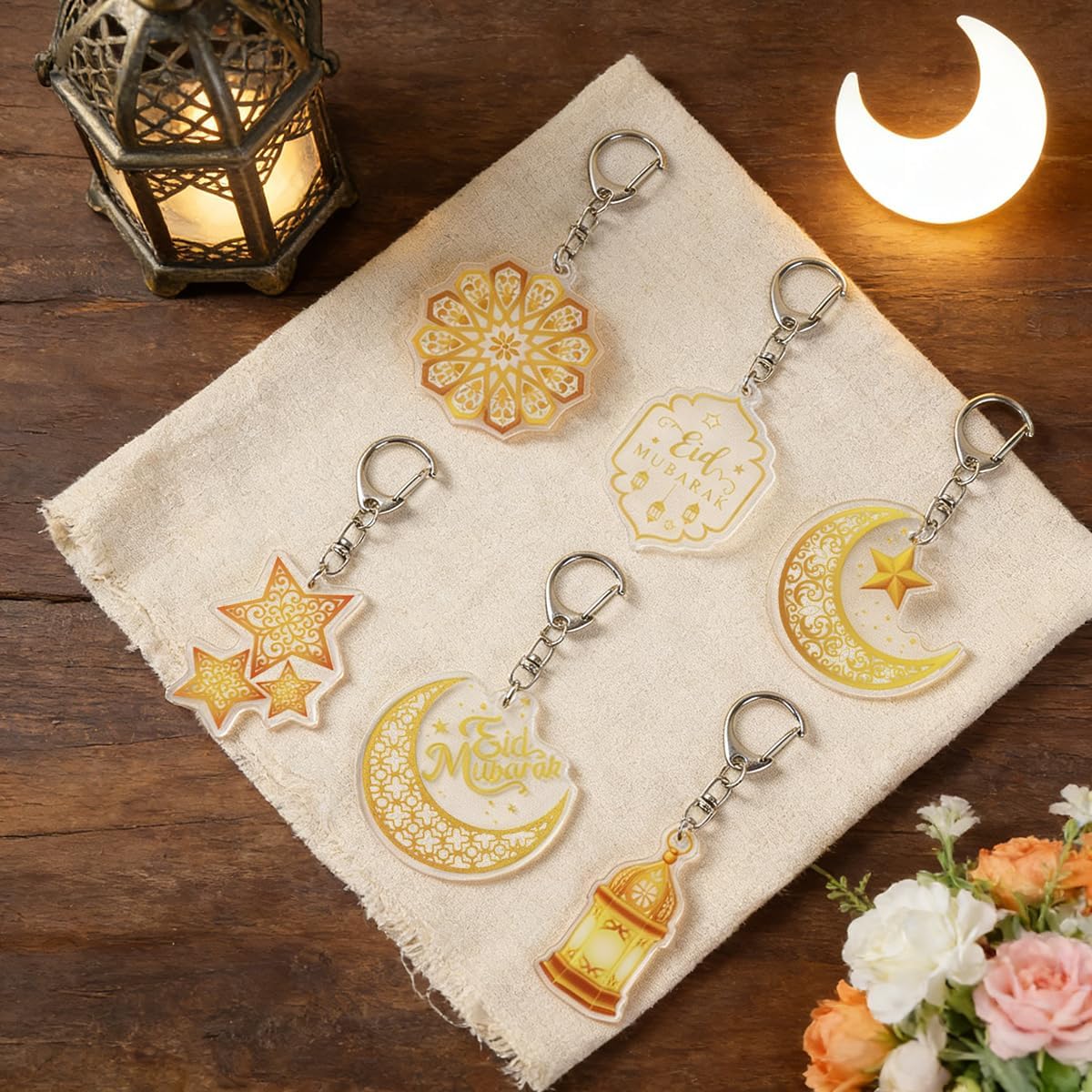 ٦ قطع من سلاسل مفاتيح عيد مبارك، تتضمن ميداليات على شكل نجوم وفوانيس وقمر، مصنوعة من مزيج من الأكريليك الأبيض والذهبي، وهي عبارة عن سلاسل مفاتيح تذكارية رائعة، وحامل مفاتيح إسلامي لرمضان، وإكسسوارات إسلامية..| متجر واو الأفضل ترينديول السعودية.
