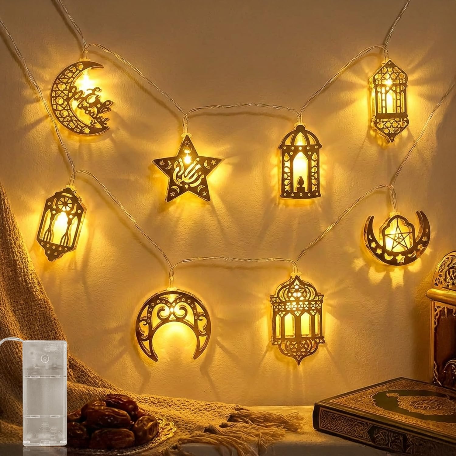 سلسلة إضاءة رمضانية مميزة بلون ذهبي، مزودة بـ 10 مصابيح LED على شكل قمر ونجمة، تُضفي لمسة جمالية على ديكور منزلك.