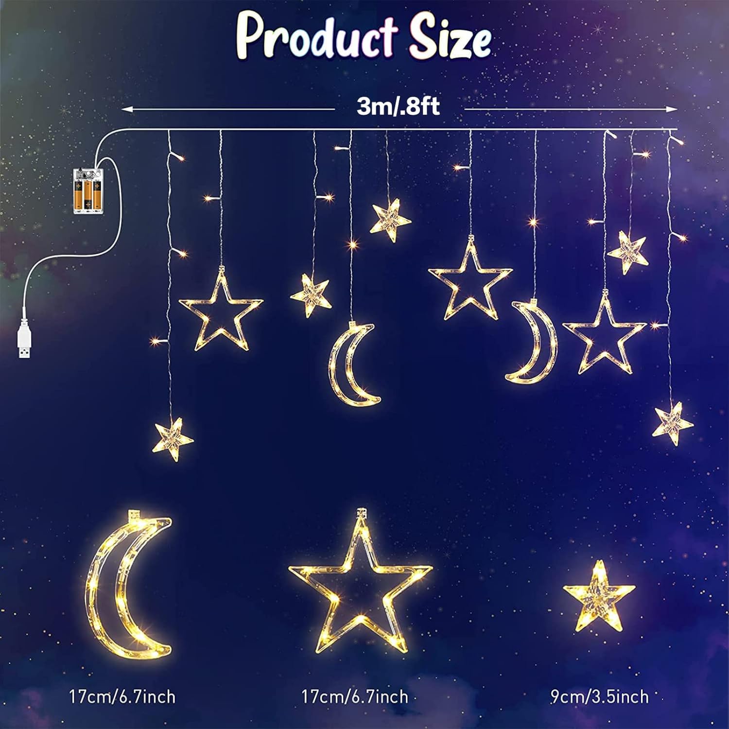🌙 أضواء سلسلة ساحرة على شكل قمر ونجمة – بتصميمها الجميل على شكل قمر ونجمة، ستجد متعةً لا تُضاهى في تزيين منزلك. ستضفي إضاءتها الدافئة والساحرة والرومانسية أجواءً مميزة على منزلك طوال العام.