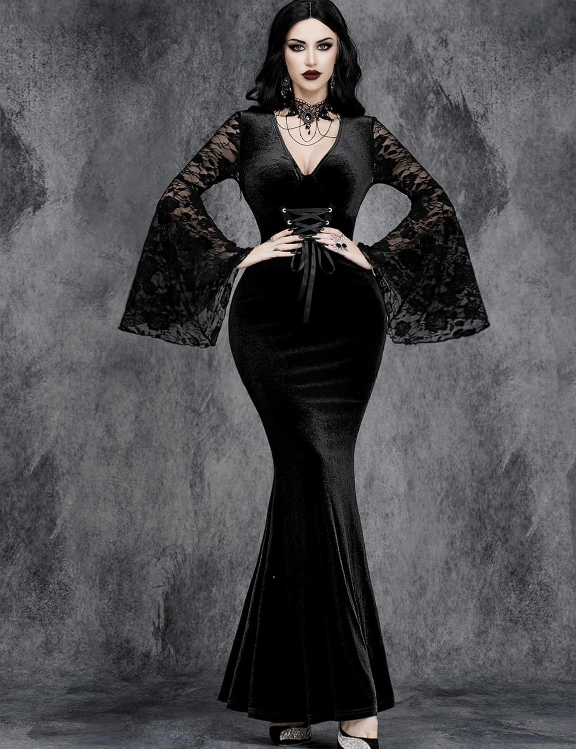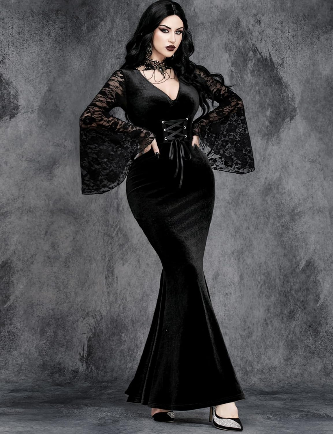 The flared sleeves are tons of fun! The fabric is a super soft black velvet that hugs your curves in all the right places.